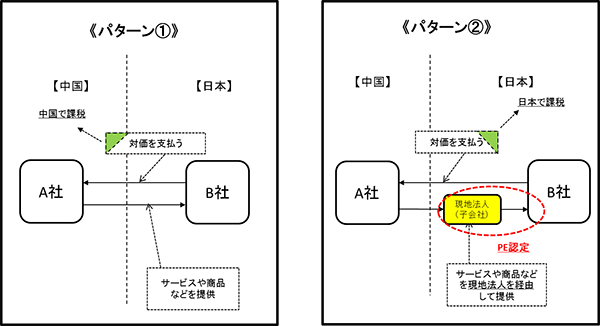 先ず、パターン①はA社が中国から日本のB社に対して恒久的施設(PE)を持たず、直接サービスや商品などを提供するタイプです。この場合はこの取引から得た対価に対して課税が掛かるのはA社が所在する中国になります。